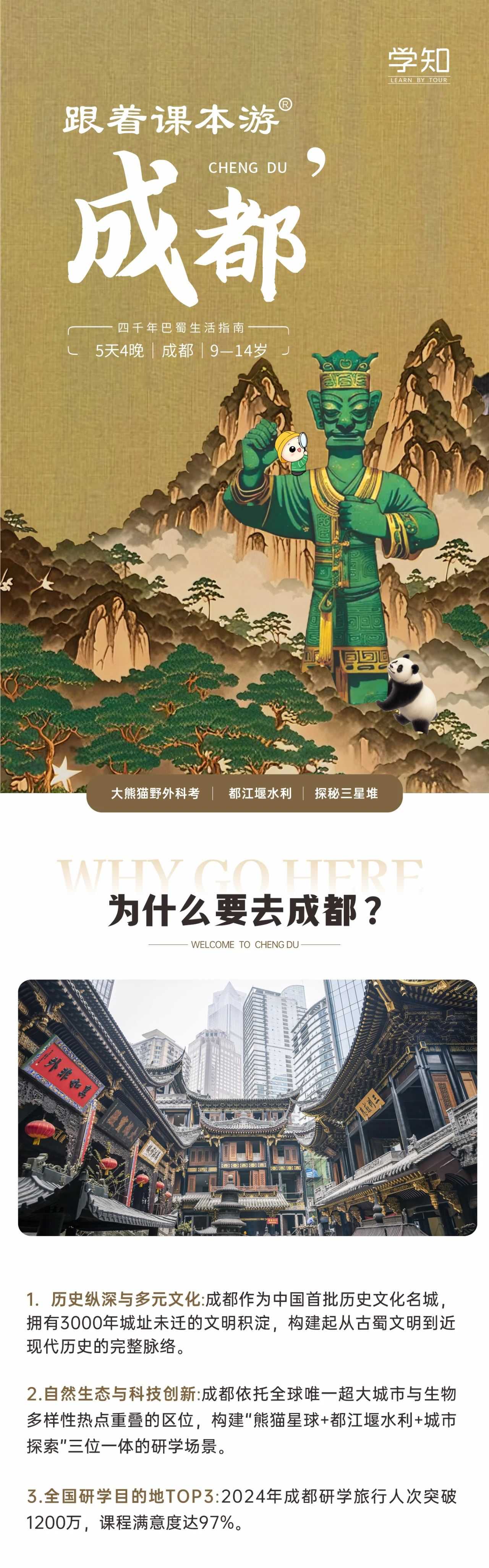 武汉研学、湖北研学、长江研学就找学知 出发成都ChengDu行程时间 |5天4晚招募对象 |9岁以上儿童,单飞独立营可报团期 | 毕业旅行:6月23日-6月27日 第1期:6月28日-7月2日 ...