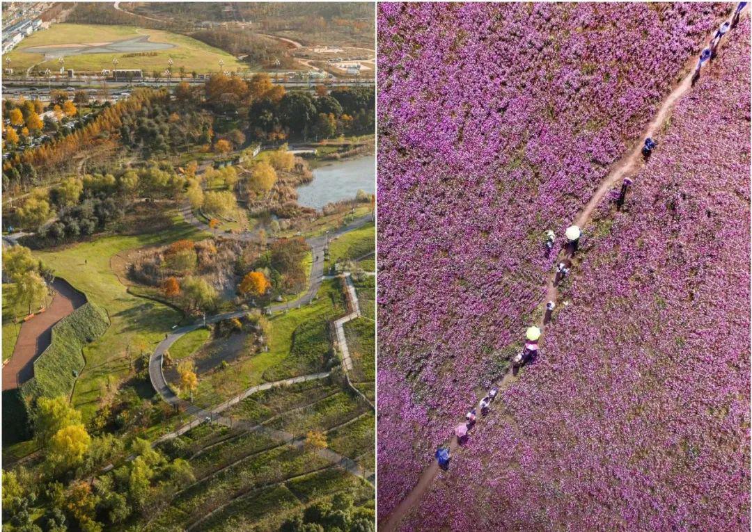 轨道沿线经过光谷生态大走廊,一路经过梯田、花海、绿道,悬空观望,天地模糊了边界,水泥森林和山丘田野相映成趣。